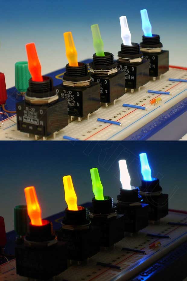 レバー部の超高輝度全面照光を実現したトグルスイッチです。車内のスイッチなどに!スイッチ定格:AC125V 6A/AC250V 3A LED定格:VF=2.27V IF=20mA