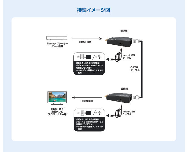 ※本製品は送信機側の電源ケーブル接続のみで動作が可能ですが、LANケーブルの通電状況によっては映像が正常に表示されない場合がございますので、受信機側も電源ケーブルを接続していただく必要がございます。