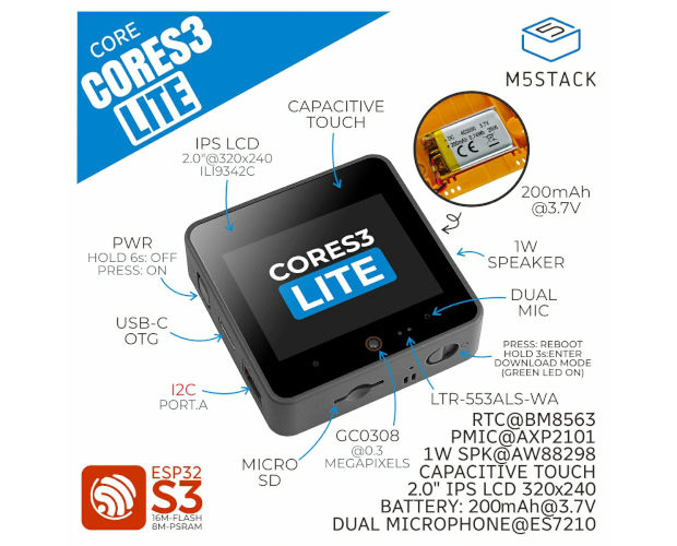 ※同じく廉価版となるCoreS3 SEには、バッテリーやカメラ、各種センサが搭載されていません。