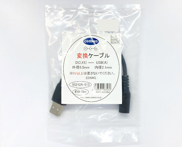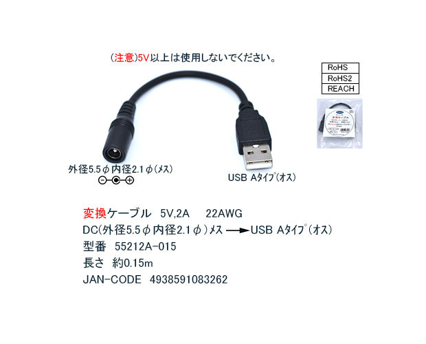 品名/型番 : | DC変換ケーブル DC2.1φジャック→USB(A)プラグ / 55212A-015 |