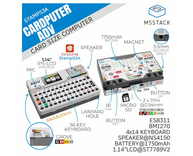 今までのCardputerと同様に56キーのキーボードと1.14インチのTFT画面により、簡単に情報を入力、表示させることができます。オンボードのデジタルMEMSマイクと内蔵スピーカーによって、録音、目覚まし、オーディオ再生のような音声操作が行えます。赤外線エミッターにより、テレビやエアコンなどの外部デバイスとの赤外線制御の連携が可能です。オーディオCODECはES8311に更新されたほか、3.5 mm径のヘッドフォンジャックも付きました。前機種同様にMicro SDカードスロットを備え、ストレージを簡単に拡張することができます。