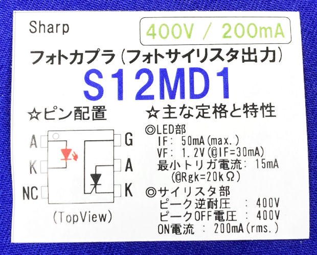 品名/型番 : | フォトサイリスタ 400V 200mA (50個入) ■限定特価品■ / S12MD1-50P |