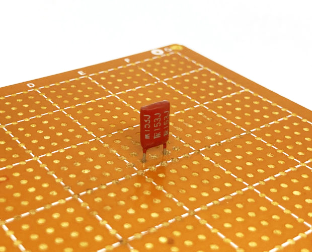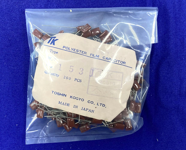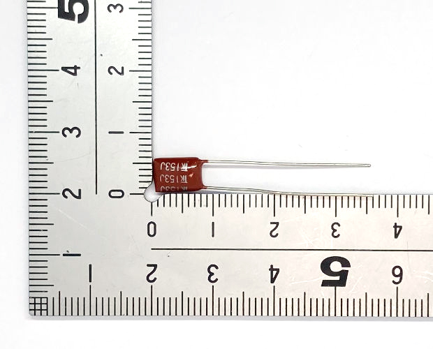 小型で電子回路定番のフィルムコンデンサ(通称マイラコンデンサ)です。