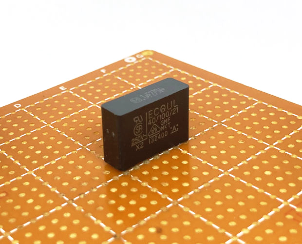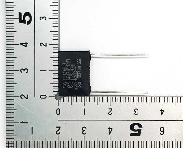 Panasonicの電子機器用フィルムコンデンサ『ECQULシリーズ』です。AC275V 0.1μF。